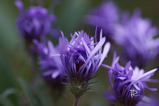 Experience the vibrant energy of "Punk Rock Petals." This dynamic macro photograph captures purple aster blooms bursting open, their petals unfurling in a delightfully chaotic and spiky display. Set against a soft, dark green background, the intense violet hues and textured forms radiate a wild, untamed beauty.