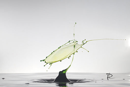 Feel the raw energy captured in "Jagged Ascent." This electrifying millisecond photograph freezes the explosive moment of liquid collision into sharp, crystalline forms. Rising from a dark base, a dynamic structure of pale yellow liquid reaches unevenly towards the sky with jagged edges and twisting momentum, scattering tiny droplets in its energetic wake against the stark white background.