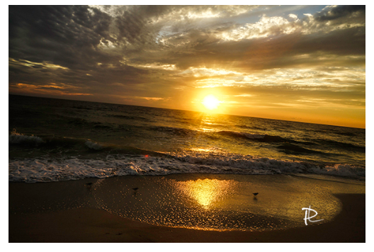 Experience the breathtaking drama of "Coastal Radiance." This powerful photograph captures the moment the sun meets the horizon, casting an intense golden path across the waves and glistening shore. Dramatic clouds part to reveal the fiery light, while gentle surf kisses the sand, reflecting the sky's magnificent display.