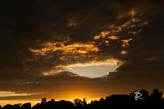 Experience the dramatic interplay of light and shadow in "Hole in Heaven." This compelling photograph captures a sunset sky dominated by heavy, dark clouds, their undersides ablaze with golden light from the setting sun. A striking opening pierces the cloud cover, revealing a window to the lighter sky beyond, creating a powerful contrast above the silhouetted treeline.