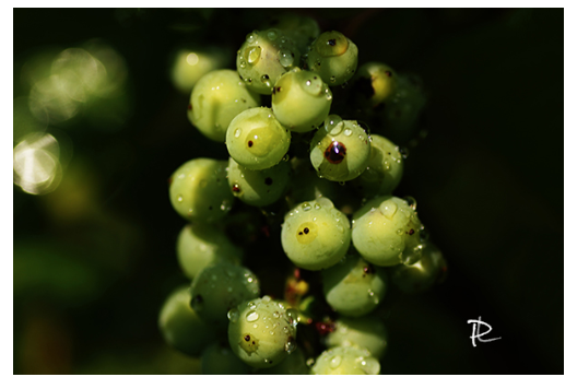 Experience the refreshing detail of "Emerald Drops." This captivating close-up reveals a cluster of young green grapes, each bead glistening with delicate water droplets left by morning dew or a recent shower. The interplay of light on the droplets against the soft, dark background highlights the nascent beauty and promise of the vineyard.