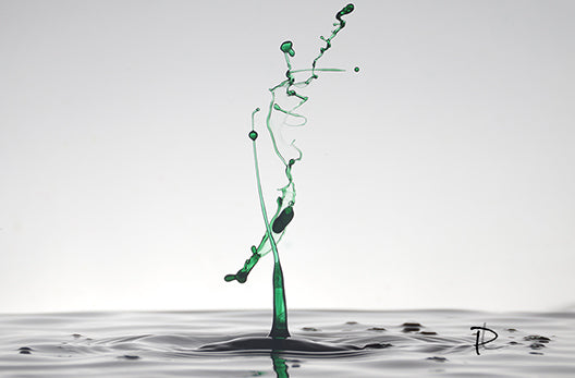 Celebrate the sheer joy of motion with "Ephemeral Exuberance." This dynamic frozen-moment photograph captures the unrestrained energy of a liquid collision. From a dark rising column, a complex structure of vibrant green liquid bursts upwards and outwards, flinging delicate tendrils and tiny droplets in a display of pure kinetic joy, all momentarily suspended against a clean white canvas.