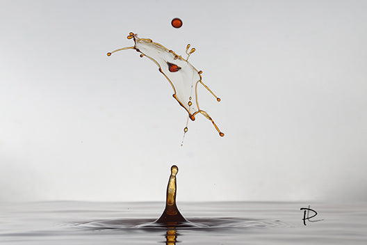 Witness this physics-defying jump captured in amber and light. This frozen leap reveals more than just interacting fluids; it's a "Momentary Leap," embodying ambition and upward striving as the fragmented splash reaches for the apex droplet before dissolving. Ideal for injecting dynamic energy and abstract intrigue into any space, this piece tells a story of fleeting aspiration.